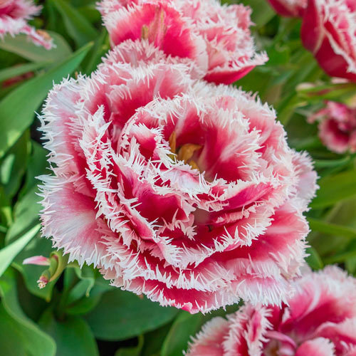 Цветет тюльпан Brest в мае, цветки пышные, с красивой белой каймой и изящной бахромой на кончиках лепестков. Отличительная особенность этих тюльпанов - игольчатая бахрома по краям лепестков, напоминающая иней. Подходит как для озеленения и украшения клумб, так и для букетов.