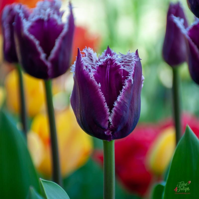 Садово-парковый и выгоночный сорт, долго держит форму бутона, имеет очень нарядный, торжественный окрас с контрастным цветовым решением. Цветки этого сорта имеют по краю лепестков рассеченность, которая похожа на бахрому. Высота стеблей 45 см. Цветение в начале-середине мая. Бутоны пурпурно-темно лиловые с белой бахромчатой каймой. Наиболее эффектно выглядят групповые посадки.
