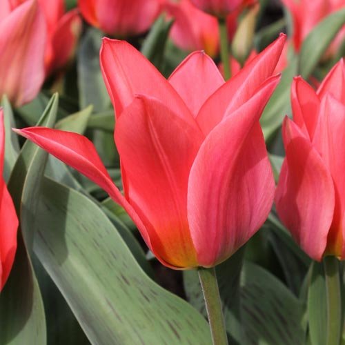 Тюльпан Торонто – один из самых необычных сортов. При этом мало того, что среди многоцветковых тюльпанов, так ещё и среди тюльпанов вообще! Невероятный цвет: телесная окраска с корралово-красным румянцем. На каждом цветоносе формируется от 2 до 4 цветков. Лепестки очень плотные, заострённые. Листья рассечены вертикальными тоненькими коричневыми прожилками. Сказка, которая так необычайно подойдёт вашему саду!