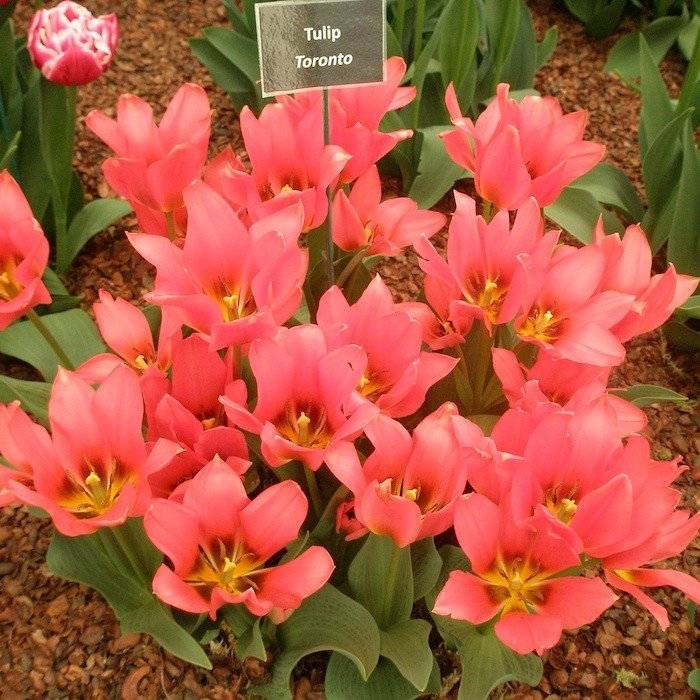 Тюльпан Торонто – один из самых необычных сортов. При этом мало того, что среди многоцветковых тюльпанов, так ещё и среди тюльпанов вообще! Невероятный цвет: телесная окраска с корралово-красным румянцем. На каждом цветоносе формируется от 2 до 4 цветков. Лепестки очень плотные, заострённые. Листья рассечены вертикальными тоненькими коричневыми прожилками. Сказка, которая так необычайно подойдёт вашему саду!