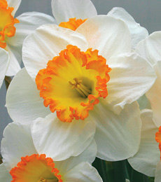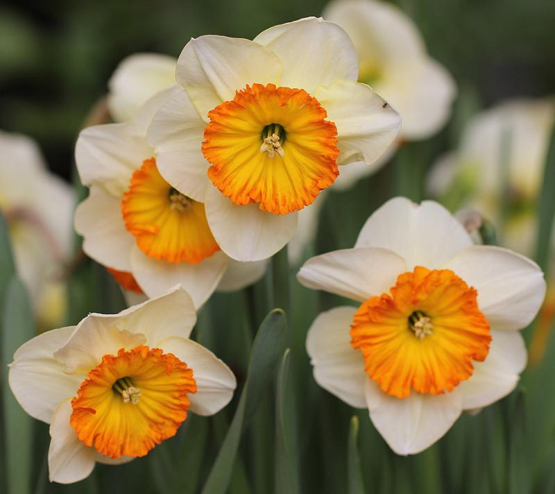 Свежая нотка в весенней песне! Округлые молочно-белые лепестки и желтая коронка с ярко-оранжевой кружевной каймой.