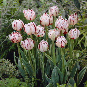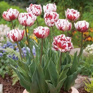 Карнавал цвета! Перламутрово-белый цветок с красными язычками пламени. Декоративные изумрудно-зеленые с кремовым кантом листья и яркие, словно кружащиеся в вальсе бокалы цветка сделают этот сорт безусловным фаворитом на Вашей клумбе.