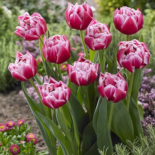 Пурпурно-розовые, слегка заостренные лепестки по краям украшены кремово-белым неравномерным кантом.