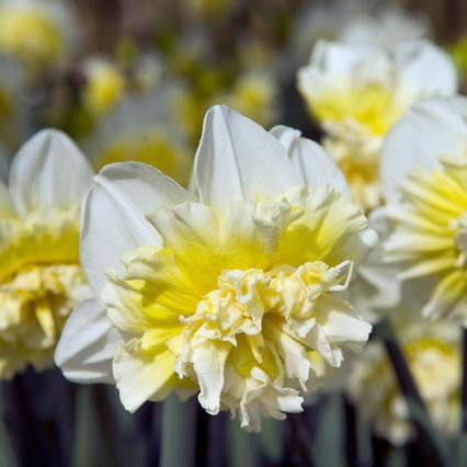 Нарцисс с махровой трубкой. Лепестки околоцветника цвета слоновой кости. Коронка чашевидная, с отогнутыми краями, плотно набитая сильно изрезанными кремово-желтыми сегментами, к концу цветения белеющими.