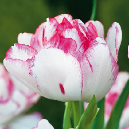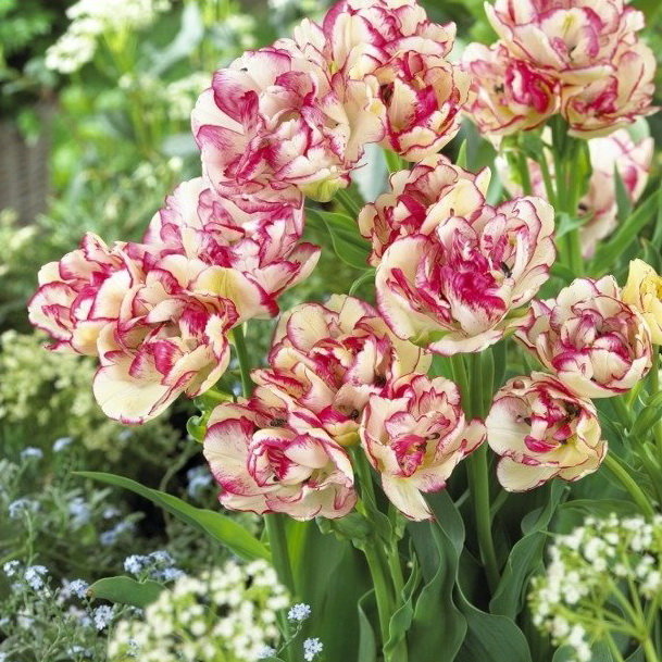 Тюльпан-хамелеон с очень крупными цветками, похожими на пионы! Волшебная окраска нежных кремовых лепестков с тонким розовым кантом и легкой штриховкой по краю. Лепестков так много, что они расходятся в стороны, придавая цветам сходство с пушистыми снежками. Очаровательный сорт!
