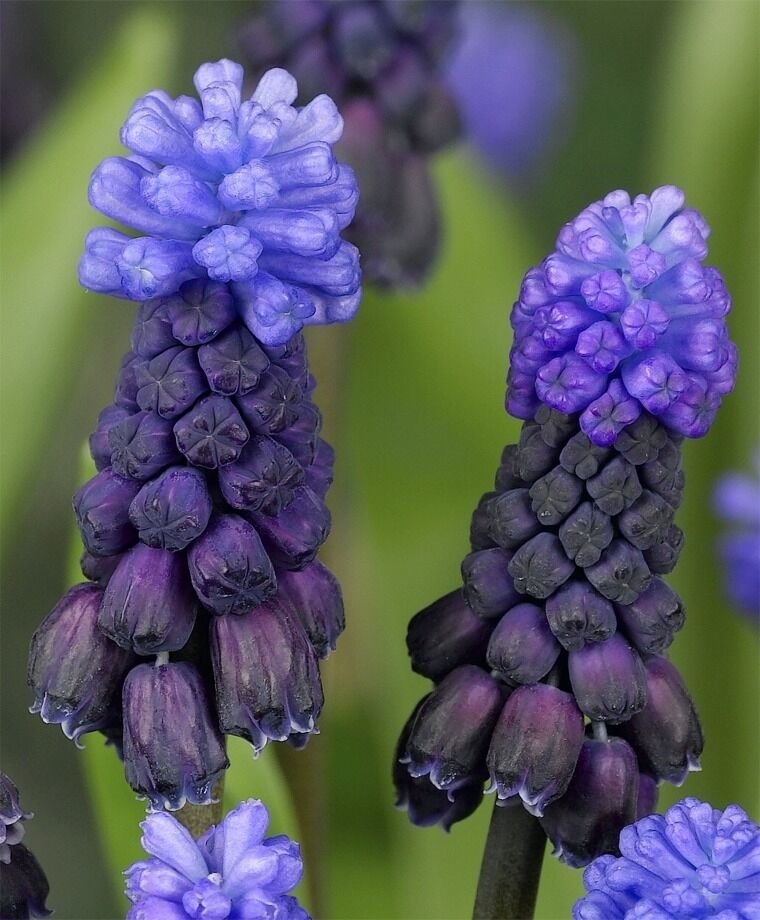 Ещё один оригинальный вид мускари. Листья широкие, напоминают тюльпановые, высота куста 15 см, соцветия состоят из нижних фиолетовых, средних синих и верхних голубых цветков.
