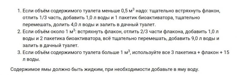 Содержит споры бактерий, способных высвобождать полезные энзимы, расщепляющие отходы. Эффективно разлагает и разжижает органику, фекалии, жиры, бумагу. Устраняет неприятные запахи разложения органических продуктов жизнедеятельности. Преимущества: Снижает затраты по откачке, очистке выгребных ям. Переработанные отходы экологически безопасны. Вносите их в компостную кучу. Безопасен для людей, животных, растений. Выгодно: 0,5 л препарата с биоактиватором (3 пакетика) достаточно для переработки 1,5 м3 содержимого туалета. Препаративная форма: Жидкость и порошок. Товарная форма и упаковка: Коробка с флаконом и пакетами. Состав препарата: Состоит из двух частей: 1 часть – флакон 0,5 л с жидким биопрепаратом, содержащим ассоциацию микроорганизмов, высвобождающих полезные энзимы и расщепляющих отходы; 2 часть – 3 пакета, содержащих по 30 г природного гумусного биоактиватора (биокатализатора) и микроорганизмы (закваски), вырабатывающие ферменты для ускорения разложения органики.