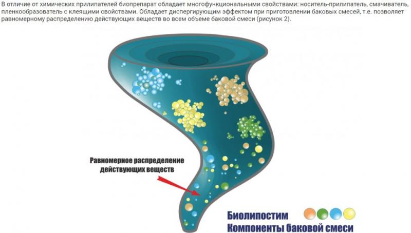 В отличие от химических прилипателей биопрепарат обладает многофункциональными свойствами: носитель-прилипатель, смачиватель, пленкообразователь с клеящими свойствами. Обладает диспергирующим эффектом при приготовлении баковых смесей, т.е. позволяет равномерному распределению действующих веществ во всем объеме баковой смеси