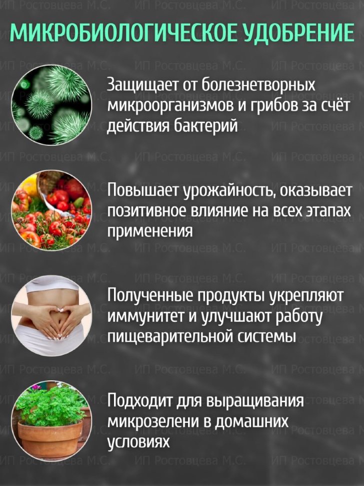 Преимущества: Защищает растения от болезнетворных микроорганизмов и грибов за счет действия бактерий Bacillus Subtilis (технология защиты растений проверена годами успешного применения препаратов серии "Фитоспорин"). Натуральные ауксины улучшают укоренение и стимулируют рост корней. Продукты, полученные с использованием препарата -- пробиотические, они укрепляют иммунитет и улучшают работу пищеварительной системы. Комплексный препарат, оказывающий позитивное и оздаравливающее влияние на всех этапах применения от рассады до "тарелки" Препарат идеально подходит для выращивания микрозелени в домашних условиях.