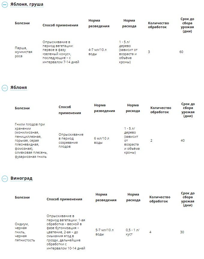 Двухкомпонентный препарат для обработки плодовых культур и винограда от комплекса болезней. Обладает защитным и лечащим действием. Характеризуется системными свойствами, равномерно распределяется внутри тканей растения, защищает молодой прирост. Уникальное сочетание действующих веществ эффективно борется с различными болезнями на винограде.