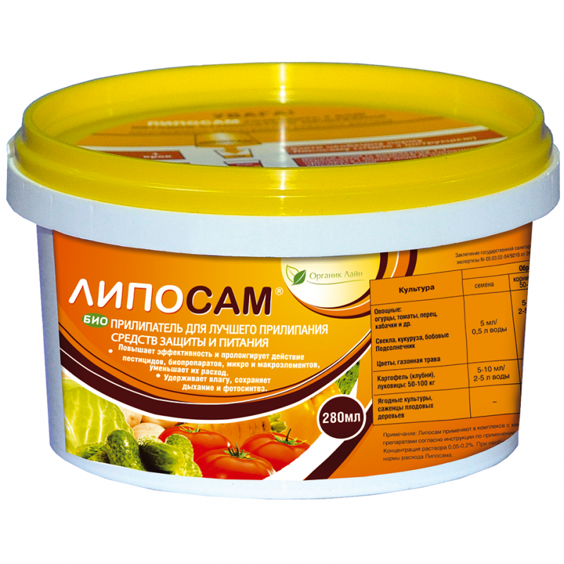 Препарат ЛИПОСАМ БИОПРИЛИПАТЕЛЬ предназначен для совместного применения с препаратами для подкормки и защиты растений от болезней и вредителей. Закрепляет на поверхности листьев и семян СЗР, удобрения, микроэлементы, усиливает и пролонгирует их действия до 30%.