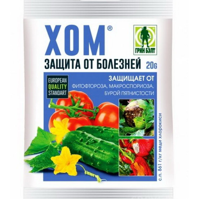 Для приготовления рабочего раствора Хом сначала разводят в небольшом количестве воды, после чего при постоянном помешивании доводят объем раствора до необходимого. Обработку растений проводят в сухую ясную безветренную погоду, стараясь смачивать листья равномерно. Опрыскивают только свежеприготовленным раствором при температуре воздуха не выше +30 градусов.