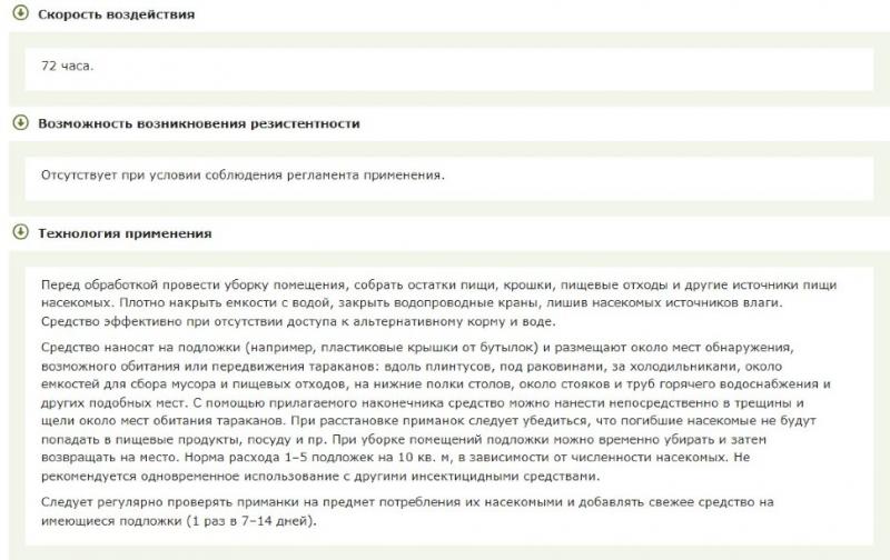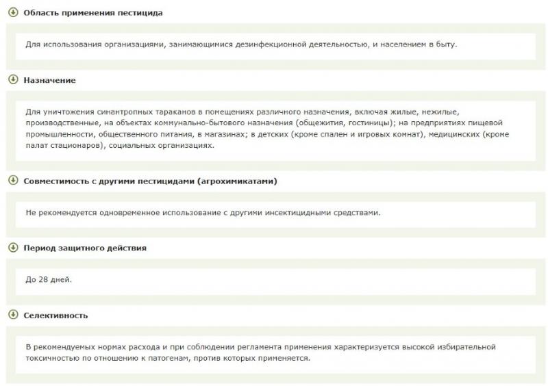 Высокая вкусовая привлекательность для тараканов. Инновационный механизм действия с эффектом биоактивации в организме вредителя. «Горизонтальное перенесение» обеспечивает вторичное (до 76 %) и третичное (до 81 %) уничтожение тараканов. Эффективная борьба с невосприимчивыми (отвращение к гелевым приманкам) и резистентными популяциями тараканов. Позитивный экологический профиль, безопасный для нецелевых объектов.