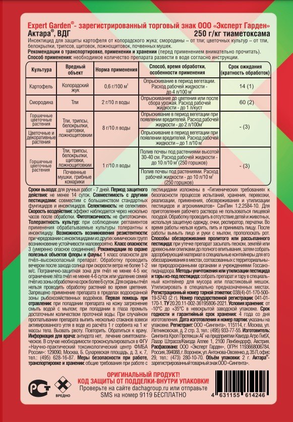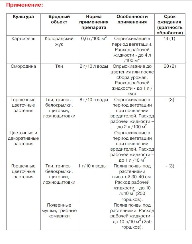 Эффективен против белокрылок, щитовок, тли, почвенных мушек. Инсектицид для защиты картофеля от колорадского жука; смородины – от тли; цветочных культур – от тли, белокрылки, трипсов, щитовок, ложнощитовок, почвенных мушек.