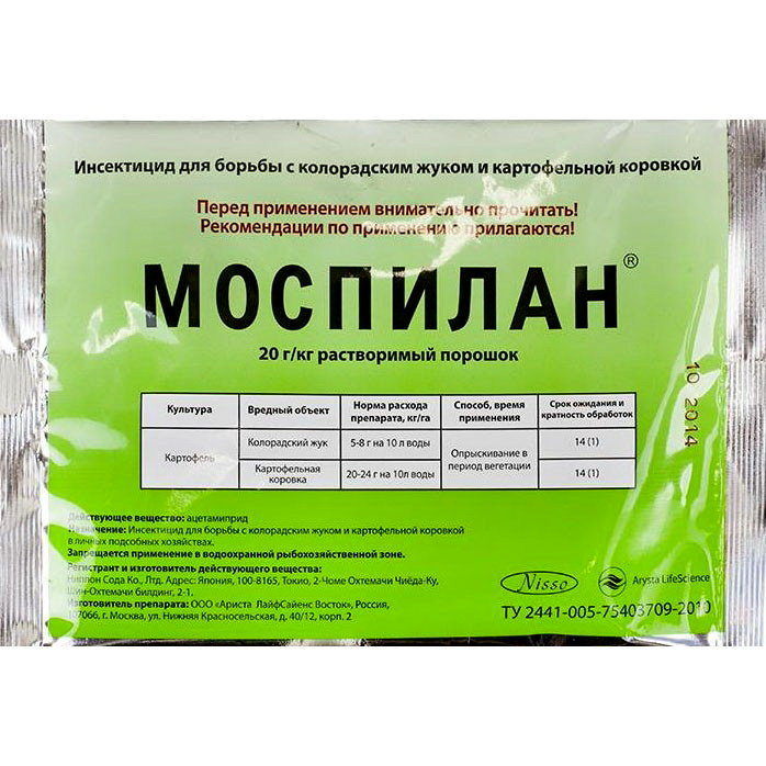 На картофеле против колорадского жука – 8 г на 10 л воды на 2 сотки. Пакет 40 г растворяется в 1 л воды и 200 мл маточного раствора на 10 л воды на 2 сотки. Достаточно одной обработки во время появления личинок.