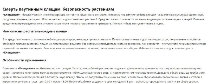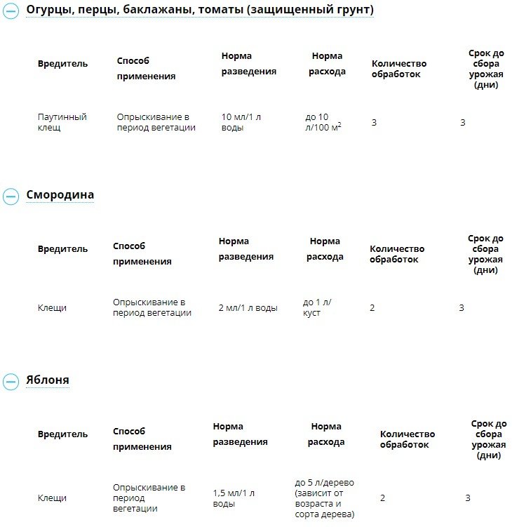 Биологический препарат для борьбы с клещами на различных культурах. Применяется в любую фазу развития растений, по мере появления вредителей. Клещи прекращают питание через 6-8 часов, а их полная гибель наступает через 3-4 дня. Имеет минимальный срок ожидания – плоды можно употреблять в пищу уже через 3 дня после обработки. Не вызывает привыкания у вредителей.