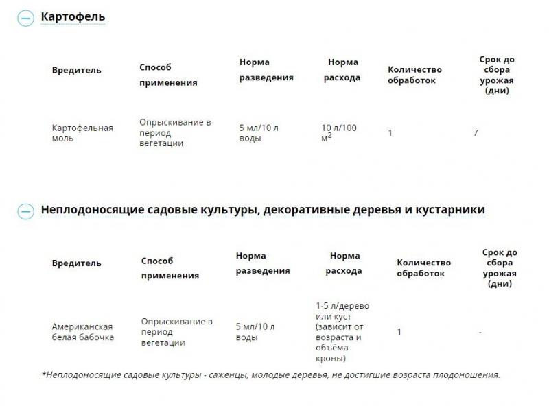 Надежная защита от картофельной моли и американской белой бабочки. Действие препарата заметно уже через 30 минут. Полная гибель вредителей наступает за 1,5-2 часа. Защищает растения на срок не менее двух недель. Уничтожает гусениц на любой стадии развития. Действующее вещество: 50 г/л эсфенвалерата. Препаративная форма: КЭ - концентрат эмульсии.