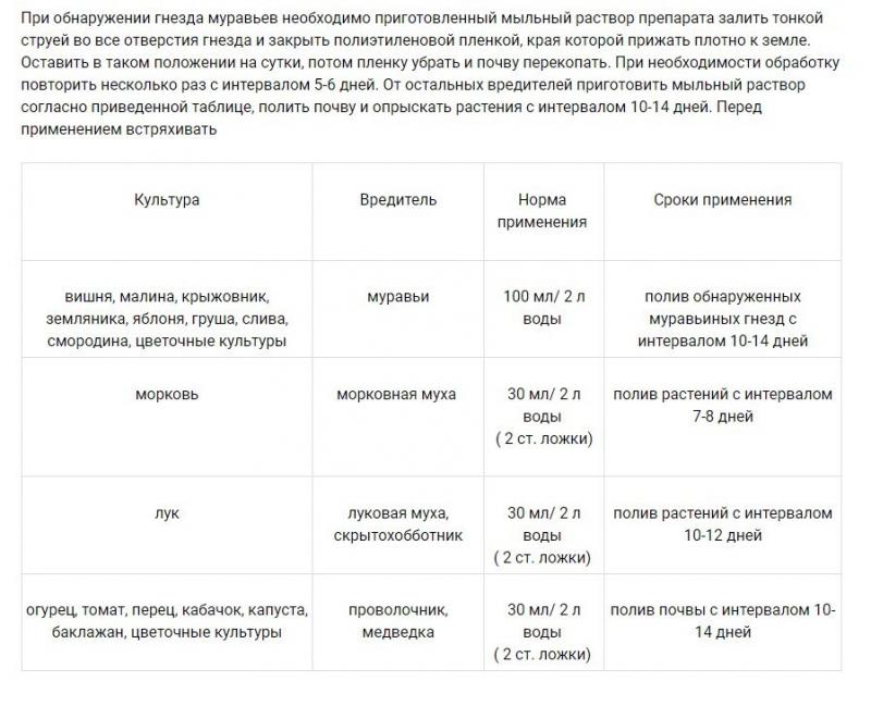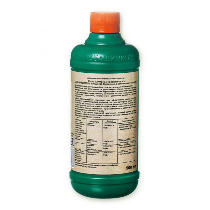 Отпугивает и уничтожает муравьев, медведку, проволочника, луковых и морковных мух, скрытохоботника. Мыло представляет собой густую коричневую жидкую смесь, основными ингредиентом которой являются калийные соли жирных кислот, березовый деготь.