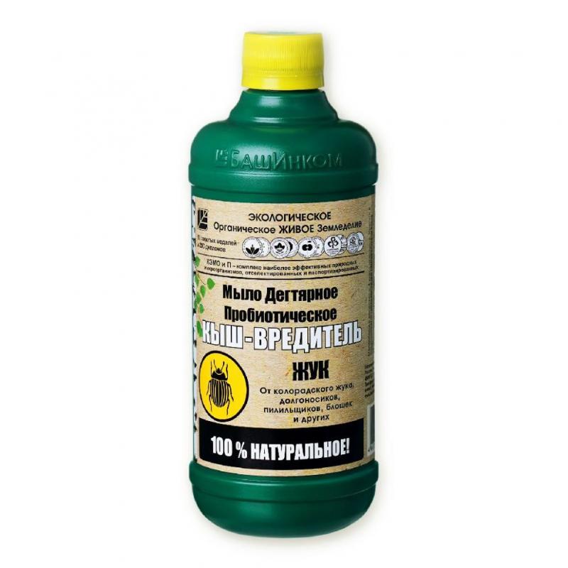 Отпугивает и уничтожает имаго и личинок младших возрастов колорадского жука, пилильщиков, долгоносиков, листовой галлицы, крестоцветной блошки. Мыло представляет собой густую коричневую жидкую смесь, основными ингредиентом которой являются калийные соли жирных кислот, березовый деготь и полезные природные бактерии – пробиотики. Преимущества: Абсолютно безопасен для здоровья человека и окружающей среды, состоит только из натуральных ингредиентов, без отдушек и красителей. Защищает от широкого перечня садовых вредителей.