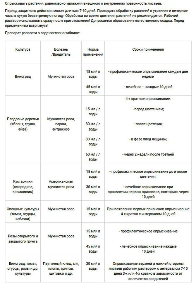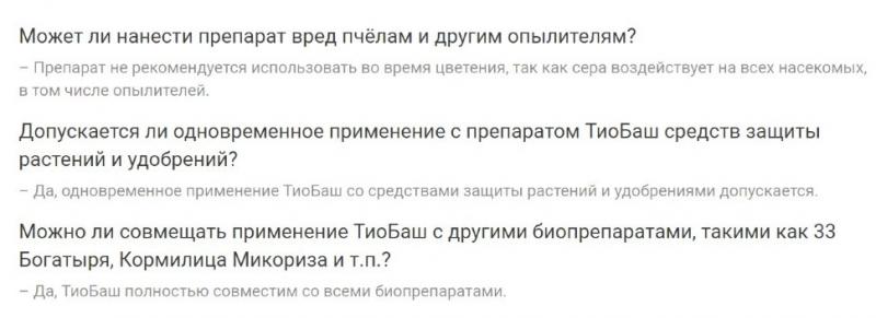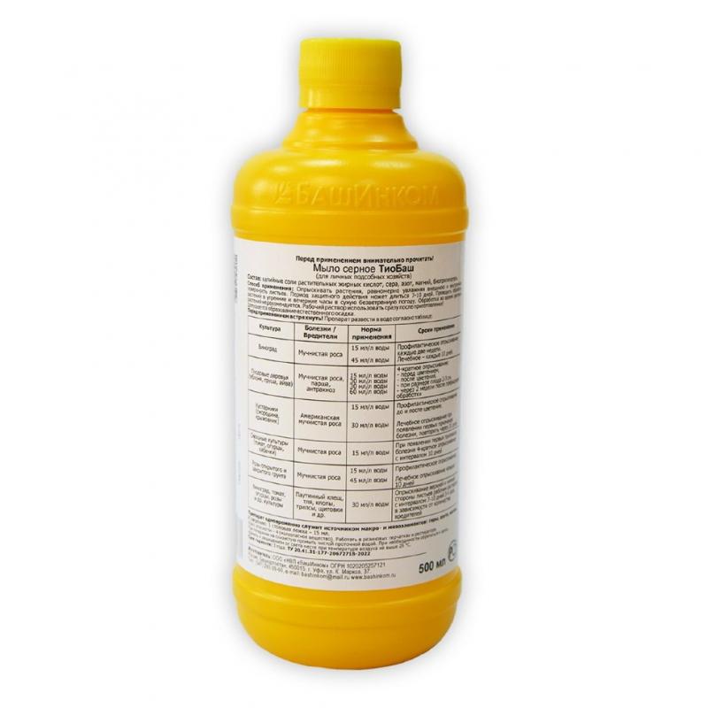 Кроме того, сера прекрасно справляется с мучнистой и ложной мучнистой росой, паршой, ржавчиной, милдью, оидиум особенно ценно это ее свойство на винограде. Препараты серы рекомендуют для борьбы с килой на капустных культурах. ТиоБаш можно использовать на всех стадиях вегетации растений, кроме цветения. Однако применять препарат против возбудителя болезни надо заблаговременно, пока он не проник в ткани растения и не вызвал заболевание. В отличие от других средств борьбы с болезнями и вредителями остатки серы достаточно легко смываются с поверхности фруктов, овощей и других плодов. К тому же сера не токсична для растений и животных.