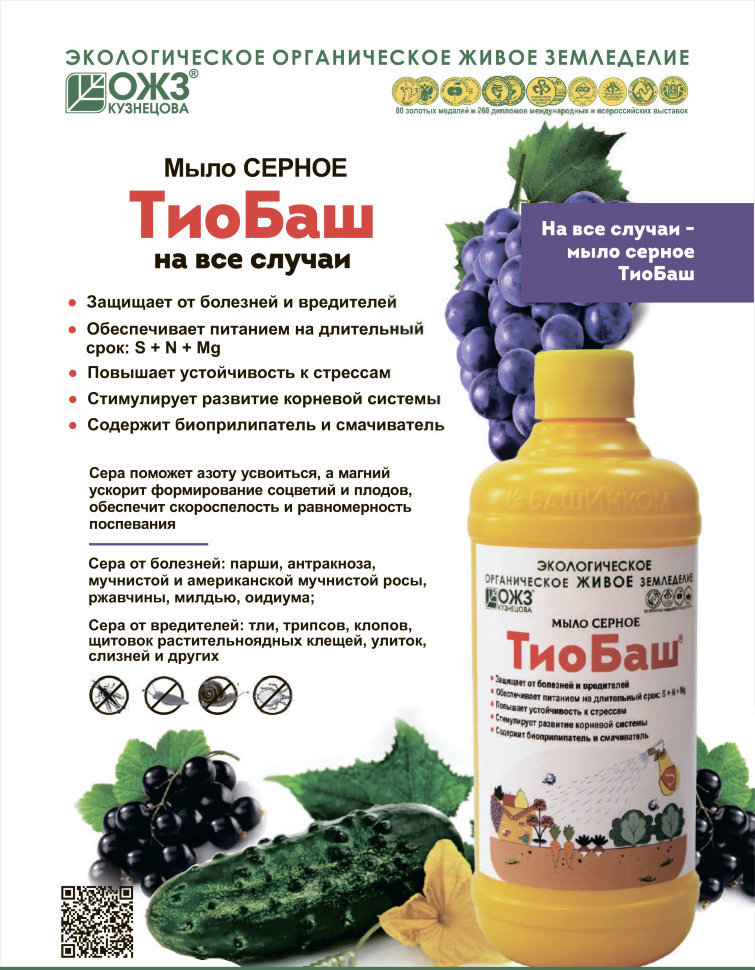 Средство для безопасной защиты растений от вредителей, болезней и пролонгированного питания растений серой. Преимущества: Комплексное действие 3 в 1: защита от широкого перечня садовых вредителей и болезней, пролонгированное питание серой; отсутствие привыкания у вредных объектов, позволяет получить обогащенный незаменимыми серосодержащими аминокислотами урожай. Препарат соответствует технологии Органического Живого Земледелия – безопасен для здоровья человека и животных, не имеет срока ожидания.