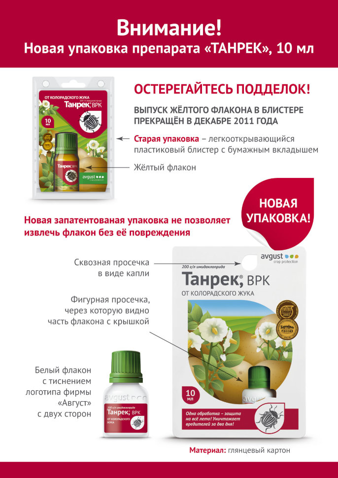 «Танрек» – средство системного действия для уничтожения колорадского жука на картофеле на всех стадиях его развития. Механизм действия: Препарат поражает нервную систему насекомых при попадании на них раствора или питании обработанным растением. Взрослые жуки и личинки утрачивают способность двигаться, они прекращают питаться, а через 2–3 суток погибают. Картофель после обработки становится несъедобным и для вредителей, прилетевших с соседних территорий. Благодаря повышенной стойкости препарата к смыванию дождевой водой защитный эффект сохраняется до 3 недель.