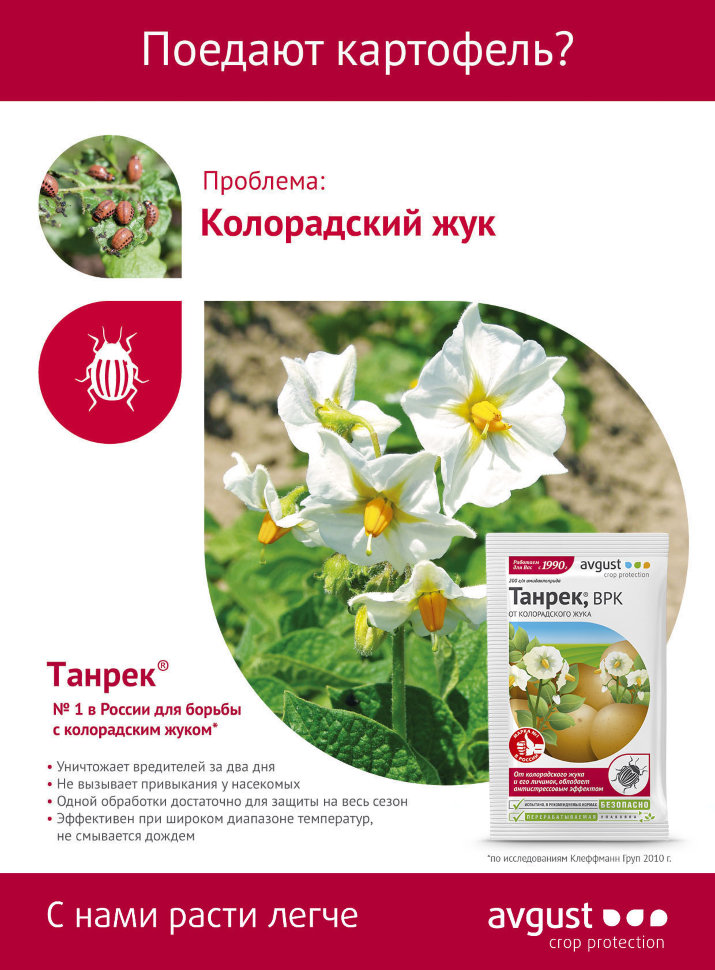 «Танрек» – средство системного действия для уничтожения колорадского жука на картофеле на всех стадиях его развития. Механизм действия: Препарат поражает нервную систему насекомых при попадании на них раствора или питании обработанным растением. Взрослые жуки и личинки утрачивают способность двигаться, они прекращают питаться, а через 2–3 суток погибают. Картофель после обработки становится несъедобным и для вредителей, прилетевших с соседних территорий. Благодаря повышенной стойкости препарата к смыванию дождевой водой защитный эффект сохраняется до 3 недель.