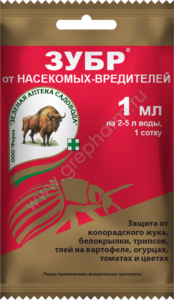 Чем Зубр лучше: мощный препарат нового поколения; активен в жару, не смывается дождем. Хорош для цветов - не имеет запаха, не оставляет следов. Еще и антистрессант. Выгодно: нужно всего 1 мл на сотку и одну обработку за сезон. Для чего и где применять: против колорадского жука на картофеле; от комплекса вредителей (тли, трипса, цикадки, клопов, белокрылки и др.) на цветочных, в том числе горшечных растениях. Как применять: опрыскивать растения при появлении вредителей. Действие и результат: системный препарат - проникает в листья, распределяется по всему растению, защищает его целиком. Уничтожает колорадского жука и его личинки любых возрастов; эффективен против скрытоживущих вредителей. Безопасность и экология: 3 класс (умеренно опасное вещество), опасен для пчел. Не применять во время цветения. Действующее вещество: Водорастворимый концентрат, 200 г/л имидаклоприда.