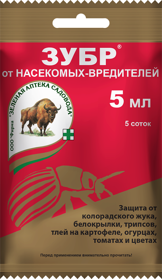 Чем Зубр лучше: мощный препарат нового поколения; активен в жару, не смывается дождем. Хорош для цветов - не имеет запаха, не оставляет следов. Еще и антистрессант. Выгодно: нужно всего 1 мл на сотку и одну обработку за сезон. Для чего и где применять: против колорадского жука на картофеле; от комплекса вредителей (тли, трипса, цикадки, клопов, белокрылки и др.) на цветочных, в том числе горшечных растениях. Как применять: опрыскивать растения при появлении вредителей. Действие и результат: системный препарат - проникает в листья, распределяется по всему растению, защищает его целиком. Уничтожает колорадского жука и его личинки любых возрастов; эффективен против скрытоживущих вредителей. Безопасность и экология: 3 класс (умеренно опасное вещество), опасен для пчел. Не применять во время цветения. Действующее вещество: Водорастворимый концентрат, 200 г/л имидаклоприда.