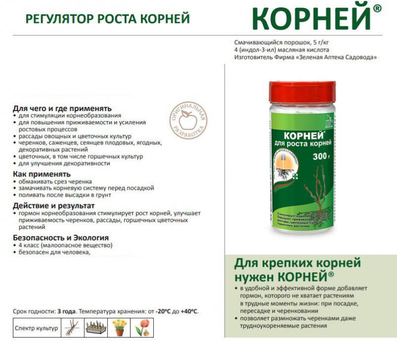 Для крепких корней нужен КОРНЕЙ! С КОРНЕЕМ легко приживаются: комнатные растения, высаженная в грунт рассада, черенки деревьев и кустарников. Для чего и где применять: для стимуляции корнеобразования; для повышения приживаемости и усиления ростовых процессов рассады овощных и цветочных культур, черенков, саженцев, сеянцев плодовых, ягодных, декоративных растений; цветочных, в том числе, горшечных культур. Как применять: опудривать срез черенка; замачивать корневую систему перед посадкой; поливать после высадки в грунт. Действие и результат: гормон корнеобразования стимулирует рост корней, улучшает приживаемость растений. Безопасность и экология: 3 класс (умеренно опасное вещество), безопасен для человека, не опасен для пчел, полезных насекомых. Препаративная форма и состав: Смачивающийся порошок, 5 г/кг 4 (индол-3-ил) масляной кислоты.