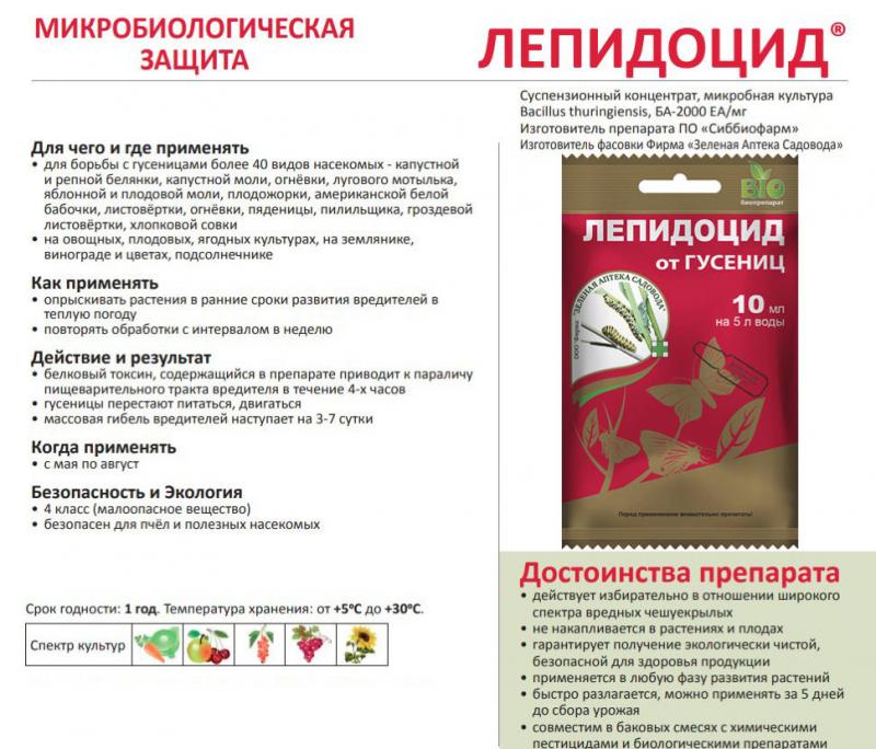 Достоинства препарата: действует избирательно в отношении широкого спектра вредных чешуекрылых не накапливается в растениях и плодах; гарантирует получение экологически чистой, безопасной для здоровья продукции; применяется в любую фазу развития растений; срок ожидания пять дней, что позволяет производить обработку незадолго до сбора урожая; совместим в баковых смесях с химическими пестицидами и биологическими препаратами. Для чего и где применять: для борьбы с гусеницами более 40 видов насекомых - капустной и репной белянки, капустной моли, огнёвки, лугового мотылька, яблонной и плодовой моли, плодожорки, американской белой бабочки, листовёртки, огнёвки, пяденицы, пилильщика, гроздевой листовёртки на овощных, плодовых, ягодных культурах, на землянике, винограде и цветах.