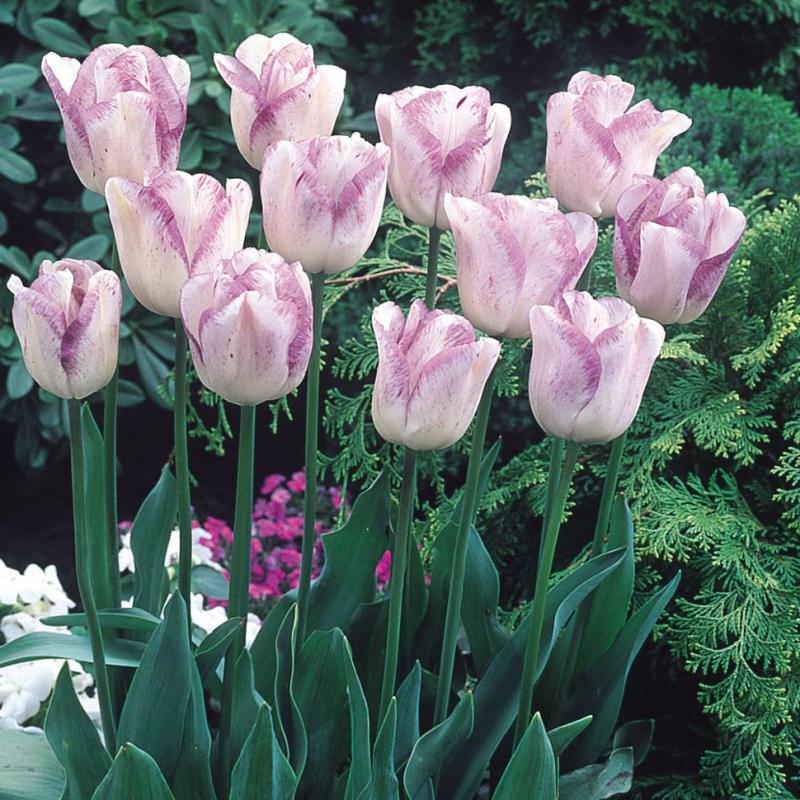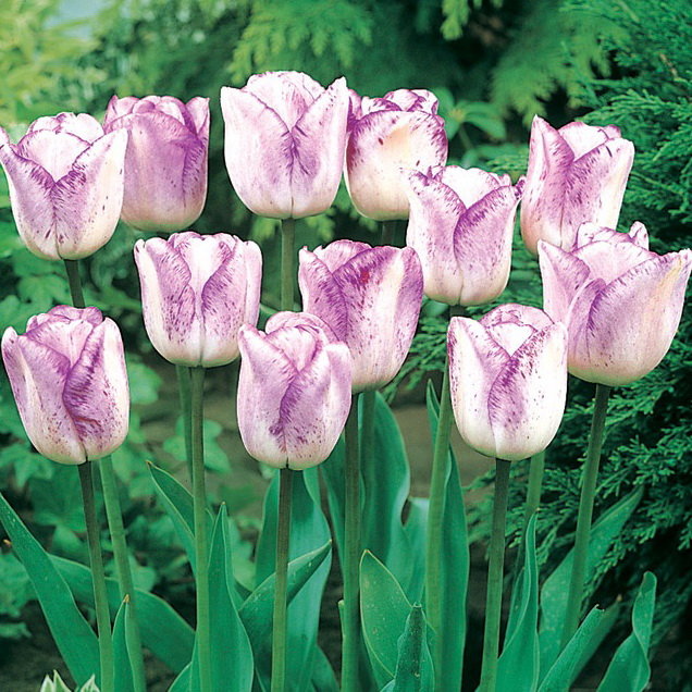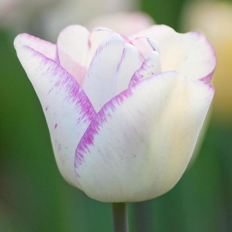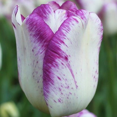 Цветок бокаловидной формы, снаружи белый с оттенком слоновой кости, каймой пурпурного цвета и штрихами пурпурного цвета по всем лепесткам. Цветет в средние сроки, около двух недель. Средний коэффициент размножения. Для срезки, выгонки, ландшафтного озеленения.