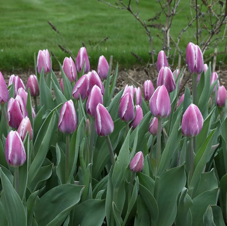 Снаружи бокал сиренево-фиолетовый с белой каймой, дно бледно-желтое, пыльники темные. Цветки идеальной классической формы выглядят очень эффектно благодаря холодной цветовой гамме. Этот сорт прекрасно подходит как для клумбы, так и для срезки.