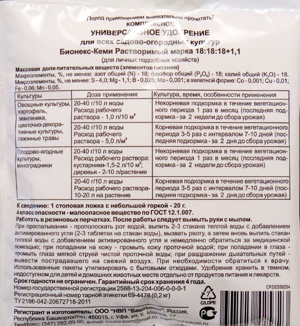 Комплексное универсальное минеральное удобрение для всех культур и видов почв. Преимущества: 1. Благодаря сбалансированному составу удобрение Бионекс-Кеми работает на всех фазах развития растения: активный рост, обильное цветение, завязывание плодов и созревание. 2. Подходит для всех культур. 3. Не содержит хлор. 4. Препарат полностью усваивается растениями – безопасен для здоровья человека и животных, обогащает продукцию макро- и микроэлементами. Препаративная форма: Порошок. Товарная форма и упаковка: Пакет, 200 г. Состав препарата: Азот общий – 18 %, фосфор общий – 18 %, калий общий – 18 %. Микроэлементы: сера – 4 %, магний – 1,1 %, бор – 0,025 %, молибден – 0,001 %; в хелатной форме: кобальт – 0,001 %, медь – 0,01 %, железо – 0,06 % и марганец – 0,05 %.