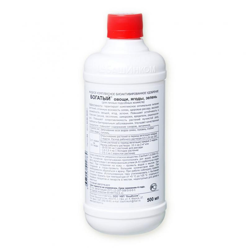 Жидкое комплексное биоактивированное полностью готовое к применению удобрение с полным набором макро- и микроэлементов плюс Гуми и Фитоспорин. Без хлора. БОГАТЫЙ – уникальное удобрение, которое обеспечивает полноценное питание растений. Гарантирует комплексное оптимальное питание растений, отличную всхожесть семян, здоровую рассаду, высокую урожайность овощей, ягод, зелени. Повышает устойчивость к стрессам (засуха, засоление, заморозки, вредители, радионуклеиды и прочие). Повышает сопротивляемость растений мучнистой росе, грибным и бактериальным заболеваниям. Улучшает качественные показатели: повышает содержание сахаров, витаминов и т.д. Преимущества: Экономичен – упаковки хватает на 200 л рабочего раствора на 3-6 соток при 6-кратном опрыскивании или удобрительном поливе 40 м2, либо при поливе 4000 шт. рассады, 200 молодых растений или 40 взрослых. Достаточно 5 капель препарата на 100 мл воды для замачивания всех видов семян, луковиц, клубнелуковиц. Полностью безопасен – не имеет срока ожидания.