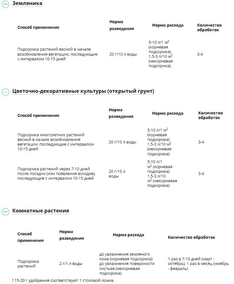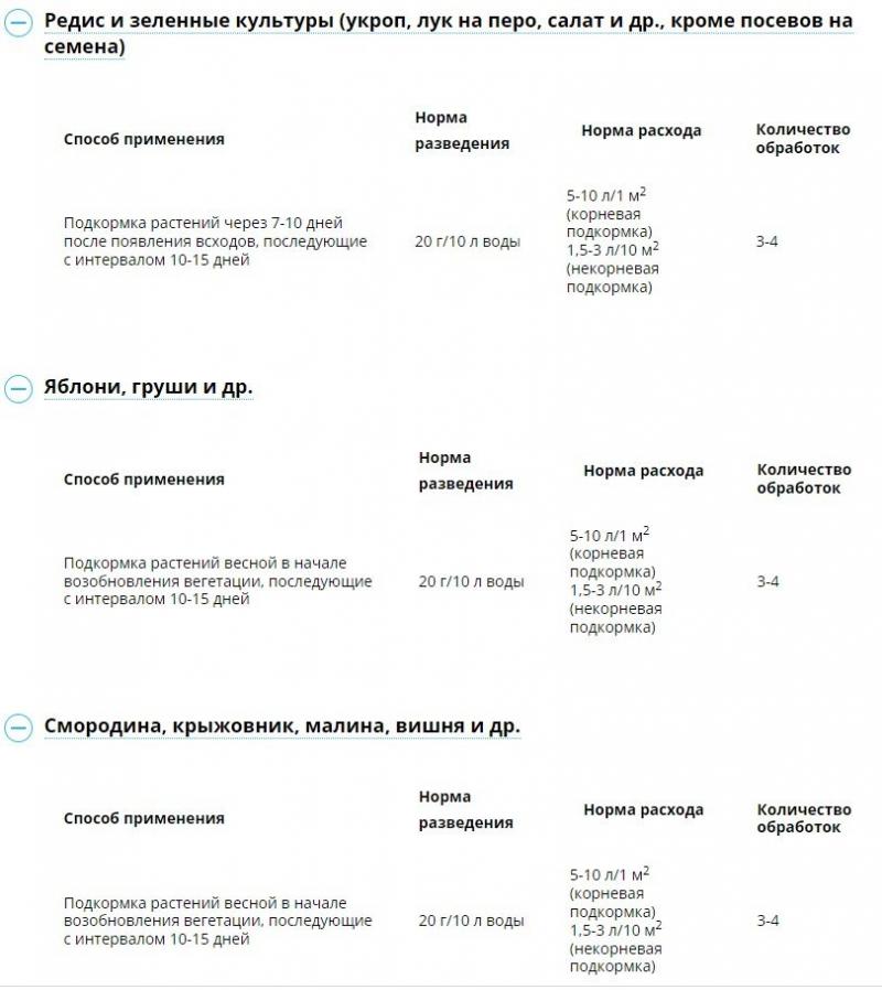 Нормы расхода рабочего раствора общепринятые и зависят от культуры и размеров вегетативной массы. При поливе растений (корневая подкормка) расход рабочего раствора составляет: 4-5 л /м² для овощных, земляники и однолетних цветочных; от 10 до 20 л на один ягодный куст в зависимости от размеров; для деревьев – от 10 до 30-50 л на площадь приствольного круга по проекции кроны (т. е. на зону залегания наиболее активных корней); комнатные растения – от 50 мл до 1 л на растение. При опрыскивании (некорневая подкормка) расход рабочего раствора в зависимости от вида культуры и вегетативной массы составляет: овощные, цветочные и земляника – 1-1,5 л /10 м², малина, смородина и пр. кустарники – 1,5-2 л/10 м²; деревья – 2-3 л на молодое, 7-10 л на взрослое дерево.