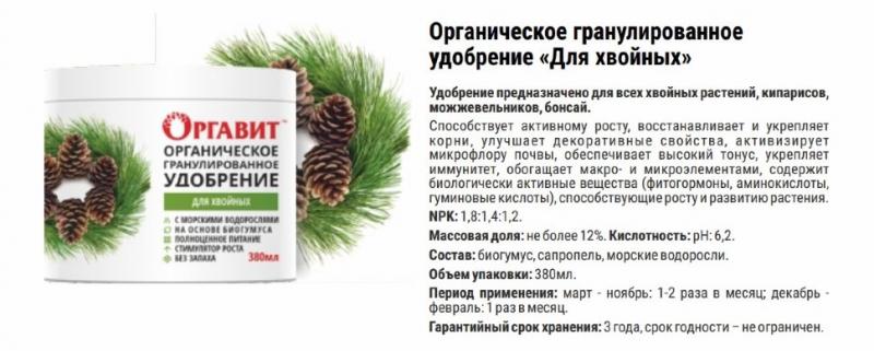 Органическое гранулированное удобрение предназначено для всех видов хвойных. Способствует активному росту, восстанавливает и укрепляет растение, активизирует микрофлору почвы.