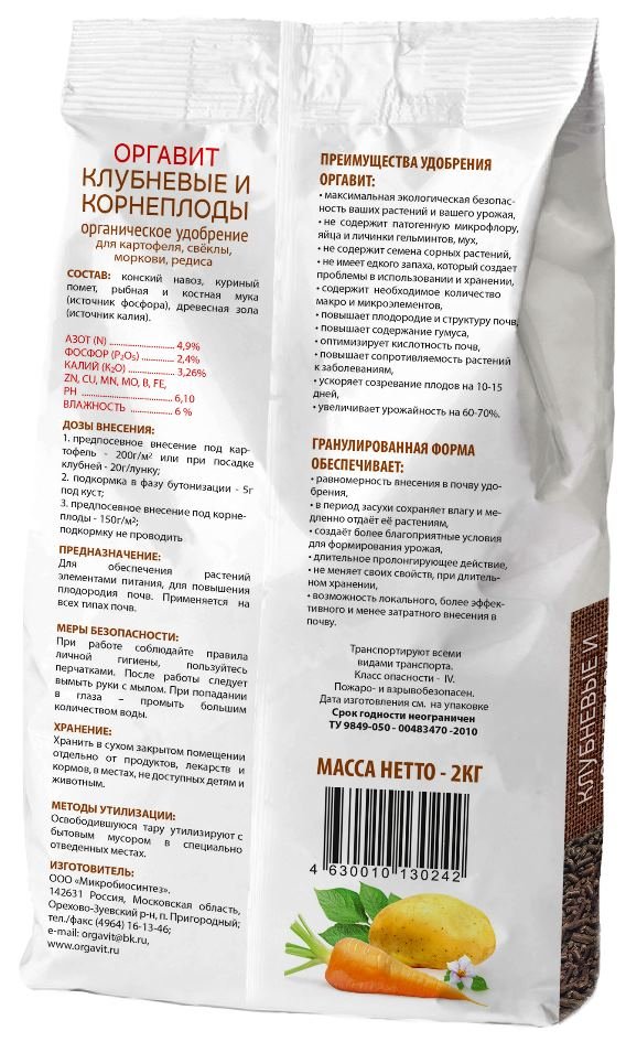 Удобрение ОРГАВИТ содержит в оптимальном соотношении все необходимые для роста растений макро и микроэлементы, разнообразные аминокислоты, витамины, фитогормоны и прочие соединения, способствующие более полному раскрытию их генетического потенциала. Гарантирует отличную приживаемость рассады, повышает темпы её роста и развития. Усиливает регенерационные процессы, увеличивает сопротивляемость растений к бактериальным и грибным заболеваниям (особенно, мучнистой росе, корневым гнилям, чёрной ножке и др.), улучшает адаптацию к колебаниям температуры, влажности почвы. Олигосахариды в составе удобрения стимулируют развитие мощной корневой системы растений, повышают урожайность, качество продукции, ускоряют созревание плодов, улучшают их лёжкость при хранении.