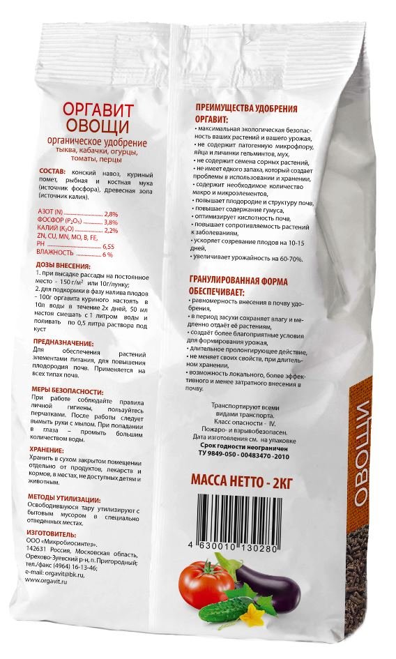 Удобрение ОРГАВИТ содержит в оптимальном соотношении все необходимые для роста растений макро и микроэлементы, разнообразные аминокислоты, витамины, фитогормоны и прочие соединения, способствующие более полному раскрытию их генетического потенциала. Гарантирует отличную приживаемость рассады, повышает темпы её роста и развития. Усиливает регенерационные процессы, увеличивает сопротивляемость растений к бактериальным и грибным заболеваниям (особенно, мучнистой росе, корневым гнилям, чёрной ножке и др.), улучшает адаптацию к колебаниям температуры, влажности почвы. Олигосахариды в составе удобрения стимулируют развитие мощной корневой системы растений, повышают урожайность, качество продукции, ускоряют созревание плодов, улучшают их лёжкость при хранении.