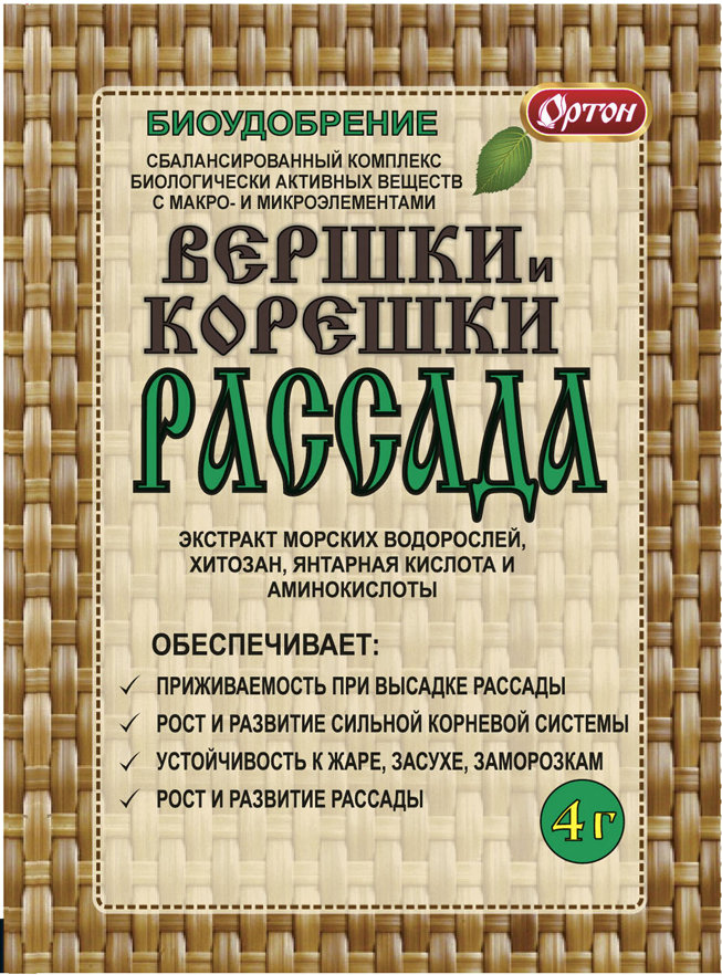 Биоудобрение. Обеспечивает приживаемость при высадке рассады, рост и развитие сильной корневой системы, устойчивость к жаре, засухе, заморозкам, рост и развитие рассады.Сбалансированный комплекс биологически активных веществ с макро- и микроэлементами. Содержит экстракт морских водорослей, хитозан, янтарную кислоту, аминокислоты. Применяется для корневых и некорневых подкормок овощных и цветочно-декоративных культур в период выращивания рассады и после высадки её в грунт.