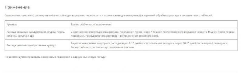 Содержимое пакета (4 г) растворить в 4 л чистой воды, тщательно перемешать и использовать для некорневой и корневой обработок рассады в соответствии с таблицей.