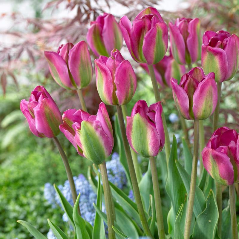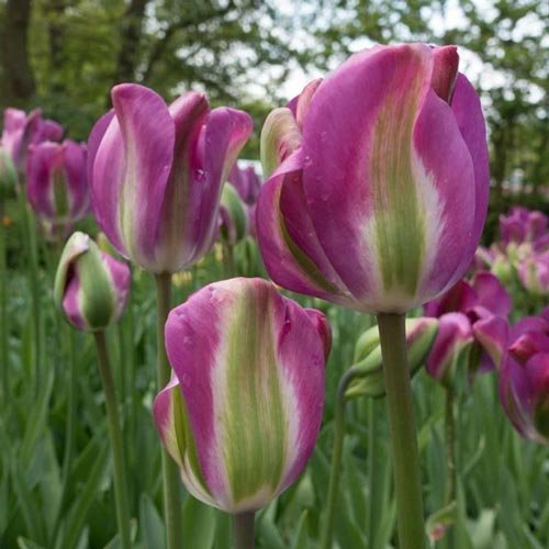 Цветовой контраст зеленой середины и краев лепестков, окрашенных в сиренево-фиолетовый цвет с зелеными продольными полосами тюльпана Nightrider, смотрится очень эффектно и необычно.
