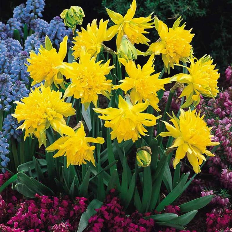 Доли околоцветника ярко-желтые, с острыми кончиками. Выросты коронки желтого и светло-желтого цвета образуют махровый центр.