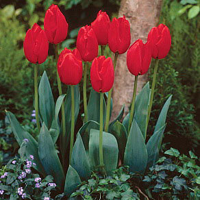 Ярко-алые бутоны бокаловидной формы на крепких, стройных стеблях высотой до 60 см. Листья с сизо-голубым восковым налетом. При посадке этих тюльпанов группой обеспечен эффект усиления цвета!