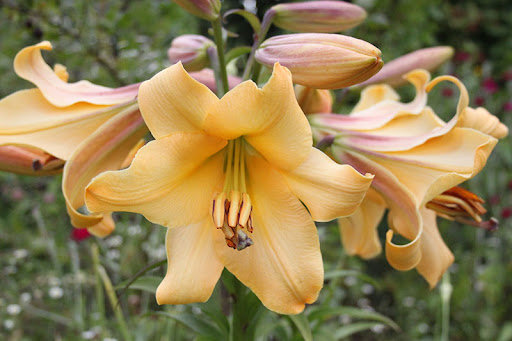 Цветки диаметром 20-25 см, воронковидной формы, теплого желтого оттенка, с лососево-оранжевым напылением с наружной стороны лепестков; аромат яркий, приятный. Края широких лепестков слегка волнистые, кончики загнуты. Неприхотливая, устойчивая к грибным заболеваниям, зимостойкая лилия.