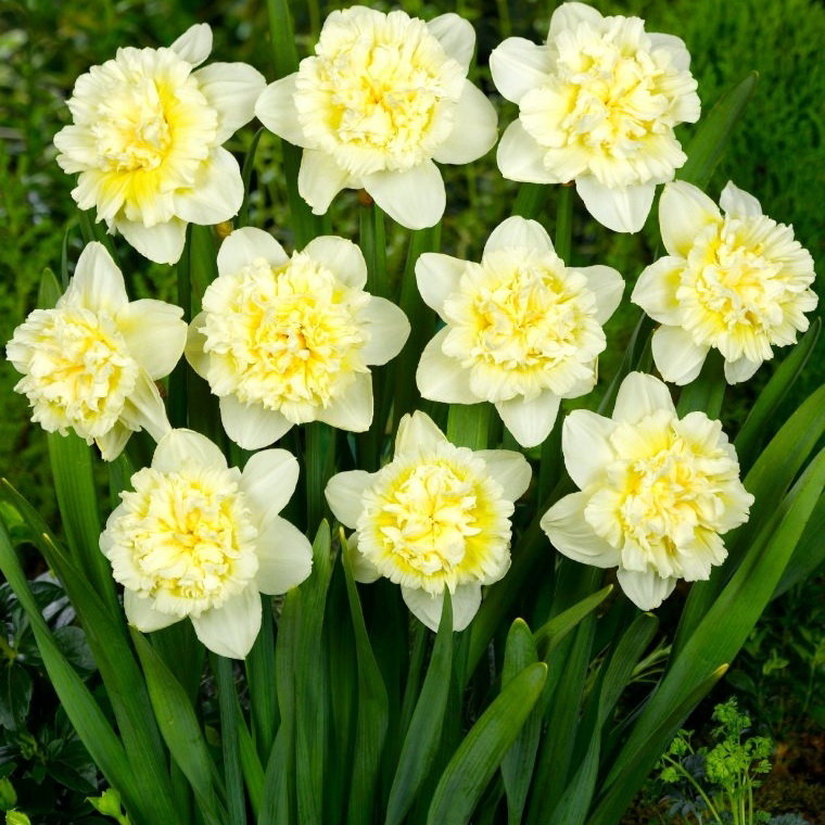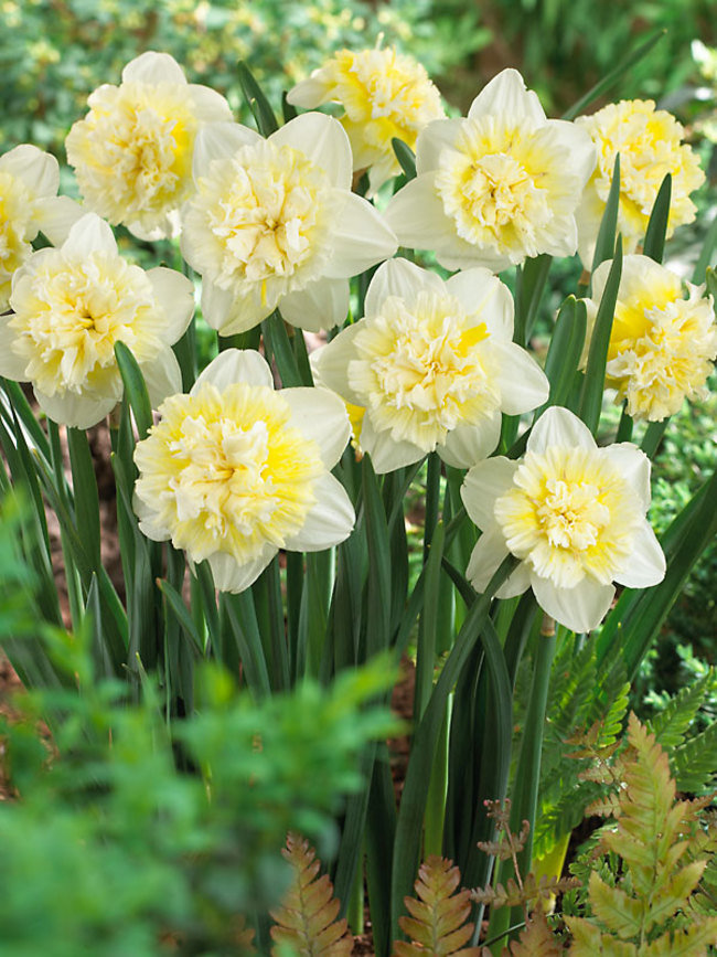Нарцисс с махровой трубкой. Лепестки околоцветника цвета слоновой кости. Коронка чашевидная, с отогнутыми краями, плотно набитая сильно изрезанными кремово-желтыми сегментами, к концу цветения белеющими.