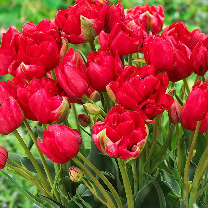 Ярчайшие алые бокалы этого махрового сорта выглядят неподражаемо аристократично. Неоценимо для центральных клумб и особенно срезки. Эстетик - букет на одном стебле. В среднем одновременно распускаются 5 алых шаров. Тюльпан относится к группе махровых ранних тюльпанов, а значит, с самого начала тёплых солнечных дней он раскроется и порадует своими плотными соцветиями.