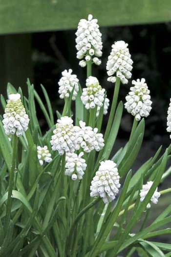 Мускари с белыми цветками очень редко встречаются в наших садах, и именно поэтому стоит обратить внимание на этот сорт. Превосходной будет смотреться в компании мускари с синей окраской! Соцветия плотные, жемчужно-белые, ароматные.