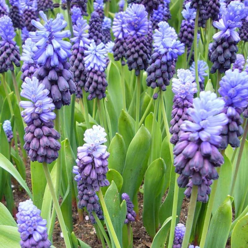 Ещё один оригинальный вид мускари. Листья широкие, напоминают тюльпановые, высота куста 15 см, соцветия состоят из нижних фиолетовых, средних синих и верхних голубых цветков.