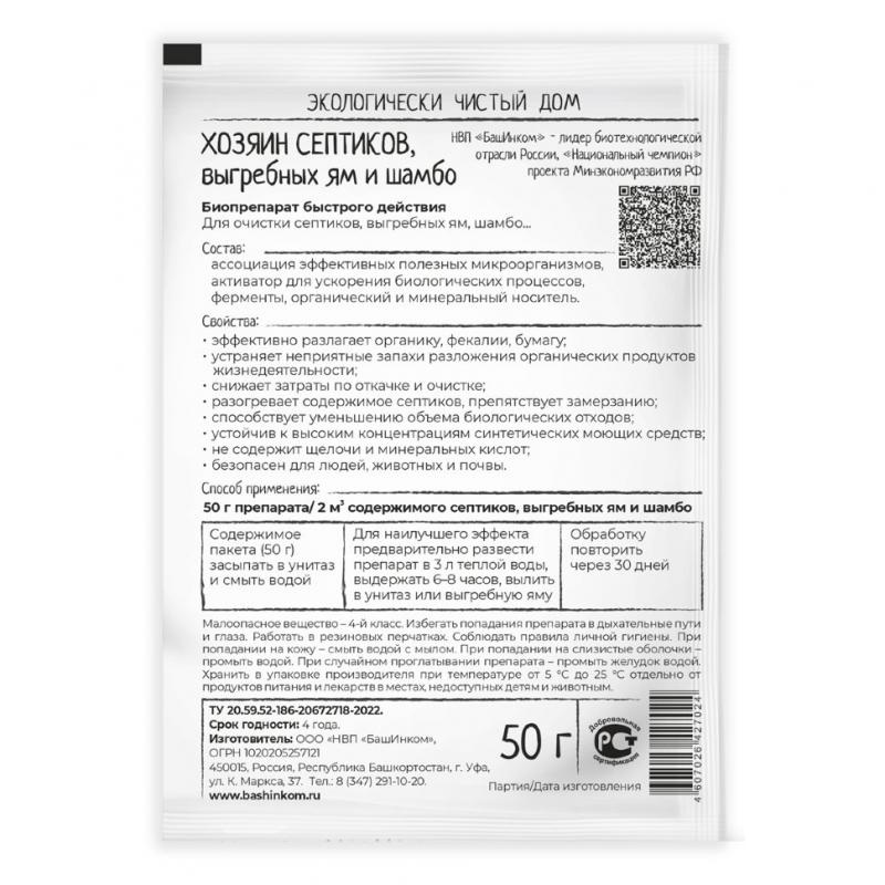 Биопрепарат быстрого действия для очистки септиков, выгребных ям и шамбо, устранения неприятных запахов. Преимущества: Эффективно разлагает органику, фекалии, бумагу. Работает при любой температуре 365 дней в году. Удобная и экономичная упаковка - одного пакета хватает на емкость объемом 2 м2. Устраняет запахи. Безопасен для человека и природы. Не содержит щелочи и минеральных кислот. Устойчив к высоким концентрациям синтетических моющих средств. Препаративная форма: Порошок. Товарная форма и упаковка: Пакет. Состав препарата: ассоциация эффективных, полезных микроорганизмов, активатор биологических процессов, ферменты, органический и минеральный наполнители.
